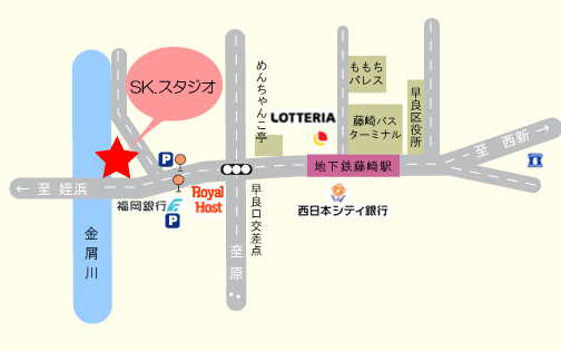 | アクセス | ![]() 地下鉄藤崎駅より徒歩3分。バス停「早良口」より徒歩1分。金屑川の隣の建物です。 ※駐車場はございませんのでお車でお越しの場合は恐れ入りますが近くの駐車場をご利用下さいませ。 ○近くの有料パーキング ・ロイヤルホストの裏手にコインパーキング ・福岡銀行の横にコインパーキング(15時以降一般料金) |